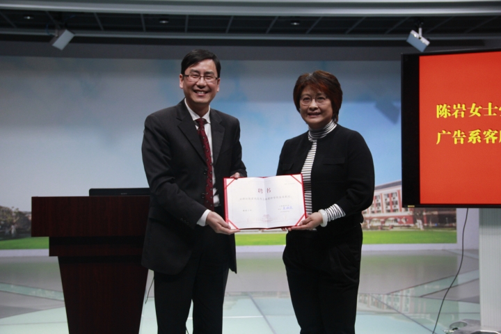 分众传媒CEO陈岩女士受聘担任我院广告系客座教授仪式暨学术讲座在此隆重举行。上午十时,我院校长朱瑞庭先生与陈岩女士一行步入会场。beat365主持工作副院长冯修文、总支书记陆佩耀、副院长高东等院领导带领广告系全体师生与会。