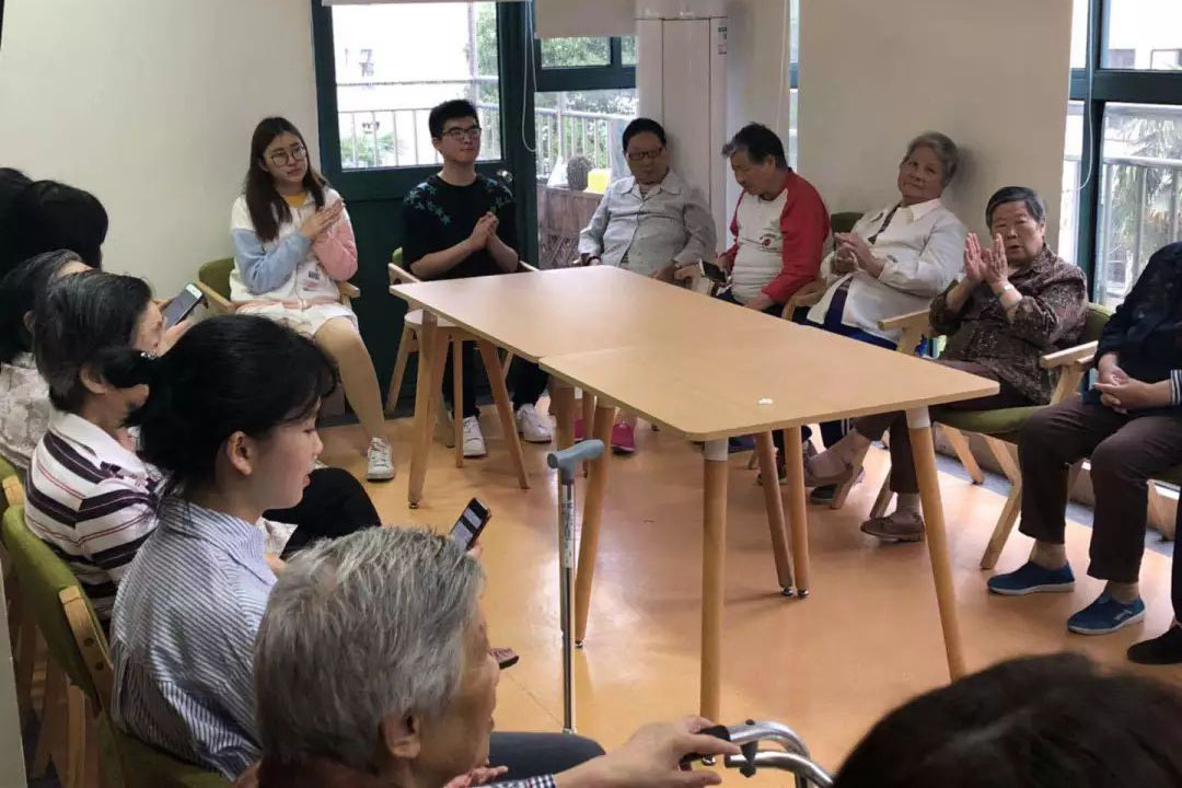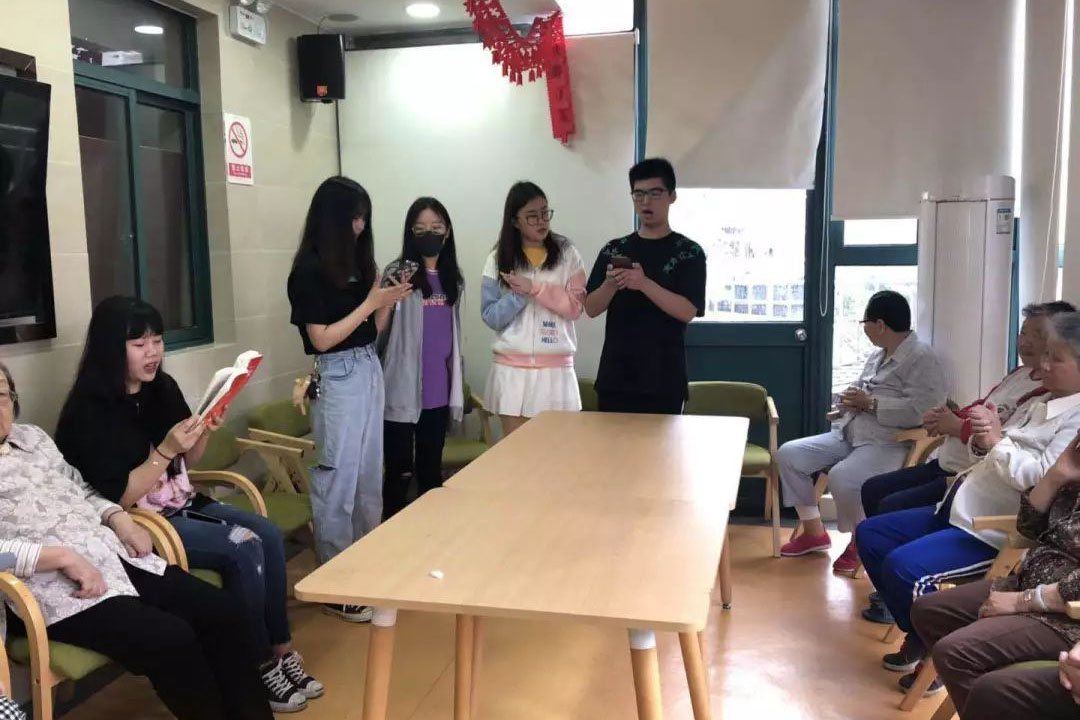 志愿者们于早上7:25在北门全家处集合完毕后便跟着领队共同前往黄浦区第二社会福利院。到达之后,志愿者们先分为两组去不同的楼层通知爷爷奶奶们来参加活动,并小心搀扶着那些行动不便的爷爷奶奶来到活动室共同活动。志愿者们先共同合唱了《我和我的祖国》、《外婆的澎湖湾》以及《水手》这三首歌,给后面表演的其他志愿者们开了个好头。之后的活动中,志愿者们仔细聆听着老人们分享给他们的故事,老人中有的人是教师,还有的是书记和退伍军人,他们看上去精神饱满,一点儿也不像七八十岁的老人家。