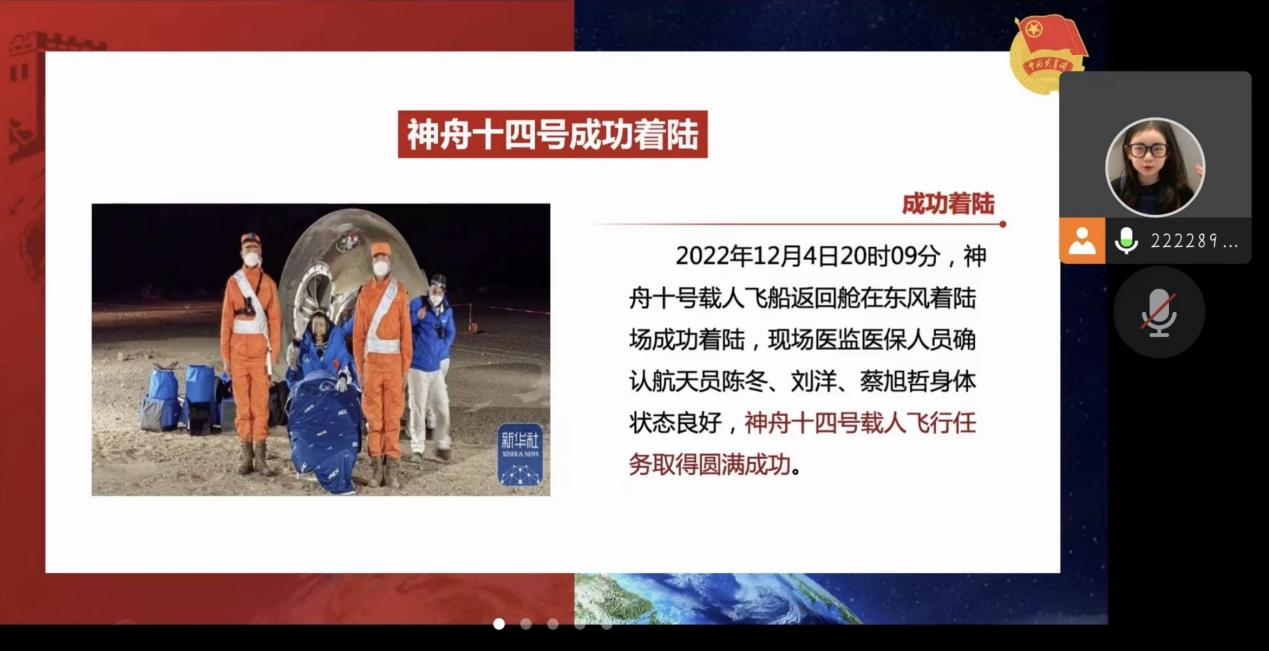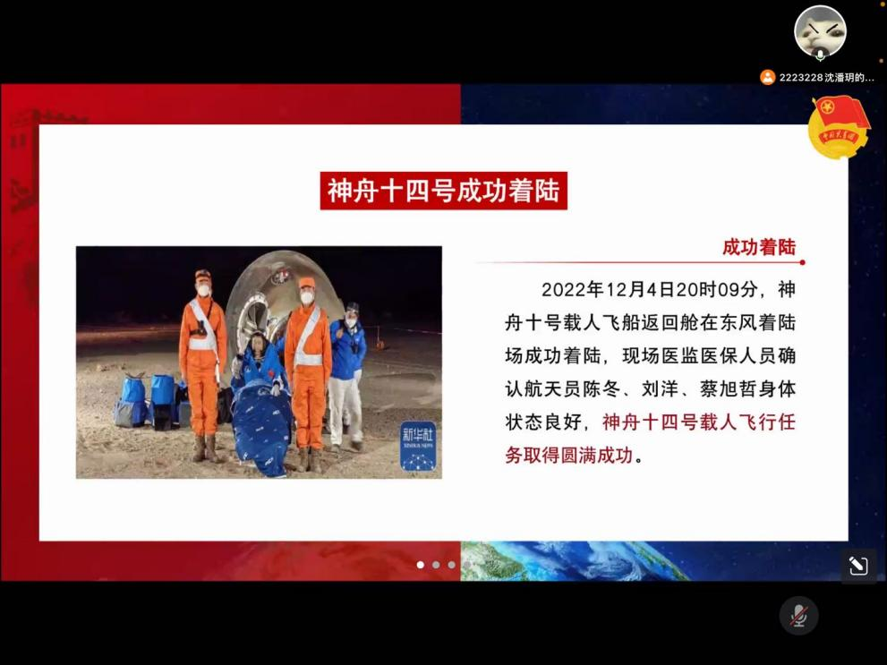 12月23日晚,新闻学B22-5班顺利开展了线上理论学习。会议伊始,团支书通过一个视频引出本次“航天点亮梦想,携手共话星辰”的主题。随后,团支书组织班内三位同学分享了航天员背后的故事,在活跃班级氛围的同时,巩固了理论学习的内容。通过本次理论学习,让同学们明白了要不断发扬中国载人航天精神,要有脚踏实地、艰苦奋斗、迎难而上的精神与力量,把祖国的荣耀写满太空。