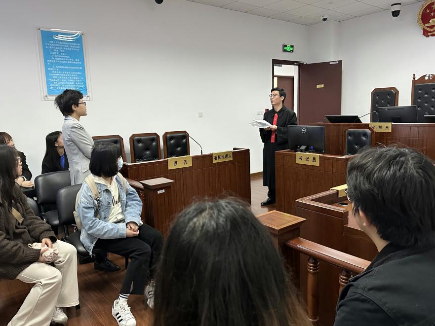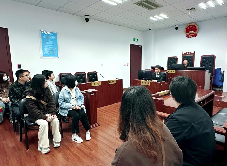 接着,师生走进法庭,旁听一起徐进法官主审的线上民事诉讼案件。观摩庭审程序,现场聆听法庭调查(双方举证和质证)、法庭辩论等环节。法庭审理结束后,徐进法官结合本次实际案例,以“合同相对性”为重要理论点,对同学们进行案情分析,现场说法。
