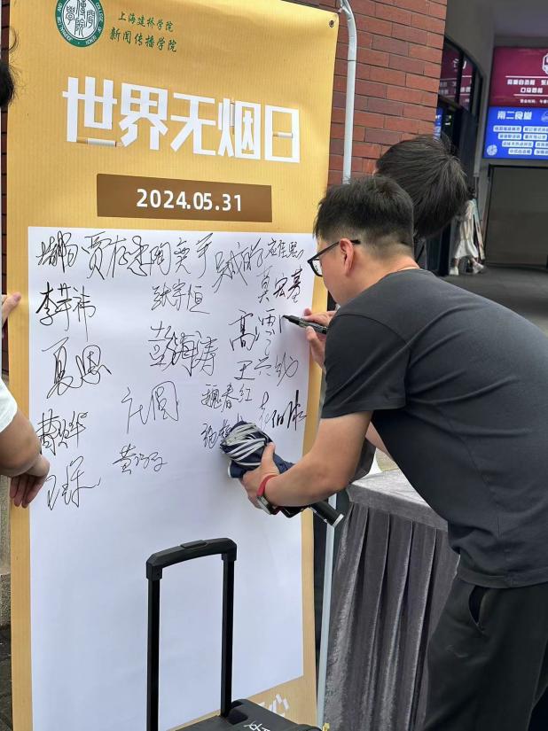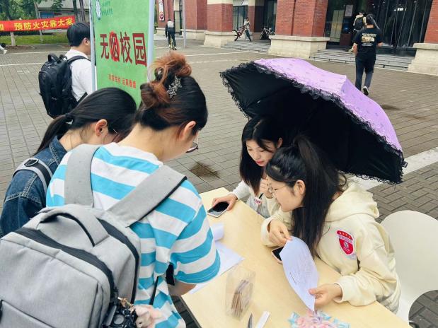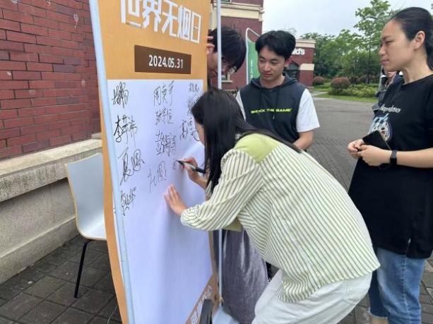 与此同时,控烟监督队的队员们引导着过往的同学们在校园禁烟承诺书的签名板上签名,签名即可获得小奖品。希望能够通过这个环节,呼吁同学们加强自我监督的同时,能够善意提醒身边的同学朋友不要抽烟,为创建无烟校园共同努力。