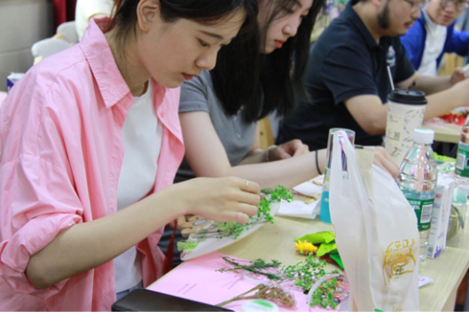随后,活动进入交流互动环节,首先是手工制作干花团扇。校友们各自挑选自己喜欢的干花材料,精心制作属于自己的扇子。在制作过程中,大家互相交流、学习,分享各自的心得体会。这简单而富有创意的手工活动,不仅让校友们重温了学生时代的乐趣,更在互动中增进了彼此之间的情谊和联系。